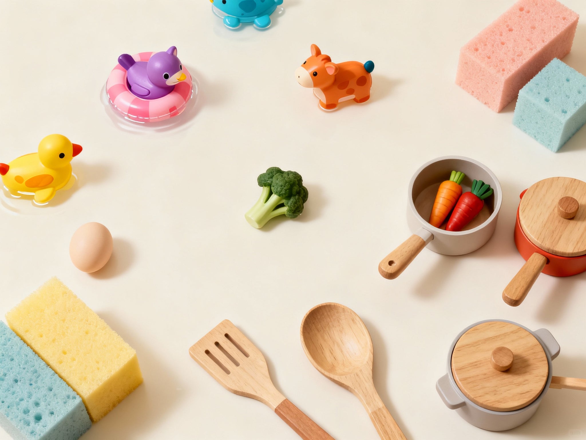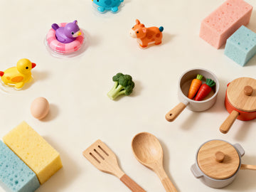A curated selection of bath toys, kitchen play sets, and soft play essentials designed for safe, simple, joyful play.